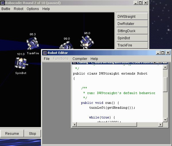 Robocode 是 2001 年 7 月在美国 IBM 的 Web alphaWorks 上发布的坦克机器人战斗仿真引擎。与通常玩的游戏不同的是:参赛者必须利用对机器人进行编程,给机器人设计智能来自动指挥它,而不是由键盘、鼠标简单地直接控制。Robocode 是一种有趣的竞赛性编程,使用几行简单的代码,就能够让你创建一个活生生的机器人,一个真正的在屏幕上与其他机器人互相对抗的机器人。你可以看到它在屏幕上四处疾驰,碾碎一切挡道的东西。机器人配有雷达与火炮,选手在躲避对手进攻的同时攻击对手,以此来较量得分的多少。Robocode 可以让你在娱乐的同时学习与提高 Java 技术。