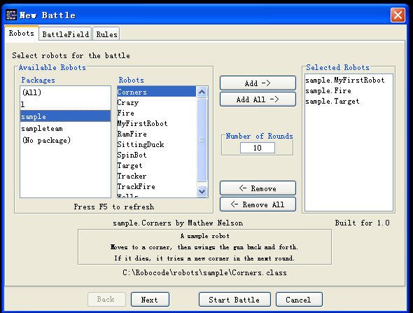 现在关闭 Editor,在进入 New Battle,Pakeage 下选择你刚才的包的名字,Robot 下就有了我们新建的 XForce 机器人了~添加进去吧,然后选择多几个其他的机器人,开始战斗!