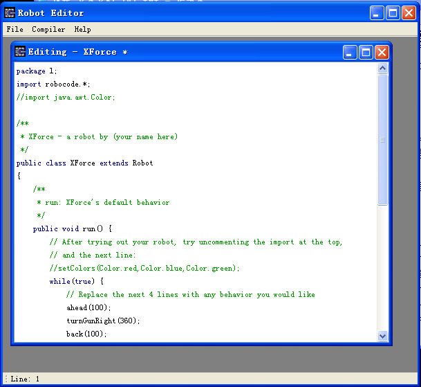 Robot Editor 是一个定制的文本编辑器,它可以用于编辑生成机器人的 Java 源文件。在它的菜单里集成了 Java 编译器(用于编译机器人代码)以及定制的 Robot 打包器。由 Robot Editor 创建并成功编译的所有机器人都会处于战场上一个部署就绪的位置。