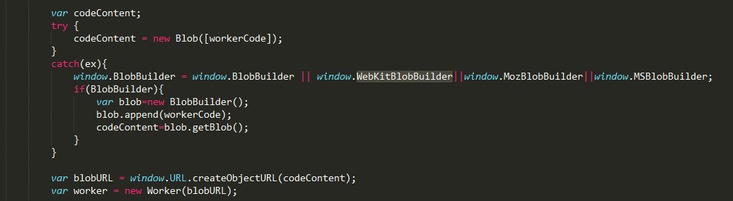 由于 worker 里需要使用 Blob 方法来把字符串的代码片段加入 worker,但是 Blob 方法只在高版本的浏览器中支持,其他较低版本的浏览器则需要使用 BlobBuilder,甚至 WebKitBlobBuilder 等。