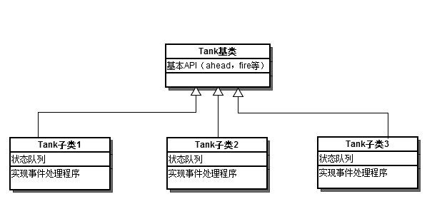 把基础 API 放在坦克的基类中,每个用户坦克作为子类继承基类,并实现自己的事件处理程序以及维护自己的状态队列。用户调用一个父类的 API(例如 ahead),直接把 ahead 状态添加到机器人的状态队列,一切都工作得很好。