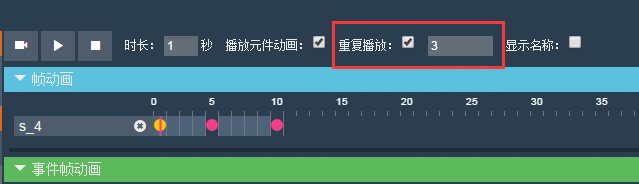 然而,我们希望文字在动画期间连续闪烁 3 次,此时我们可以选择该时间轴,勾上 “重复播放” 选项,并且设置 “播放次数” 为 3: