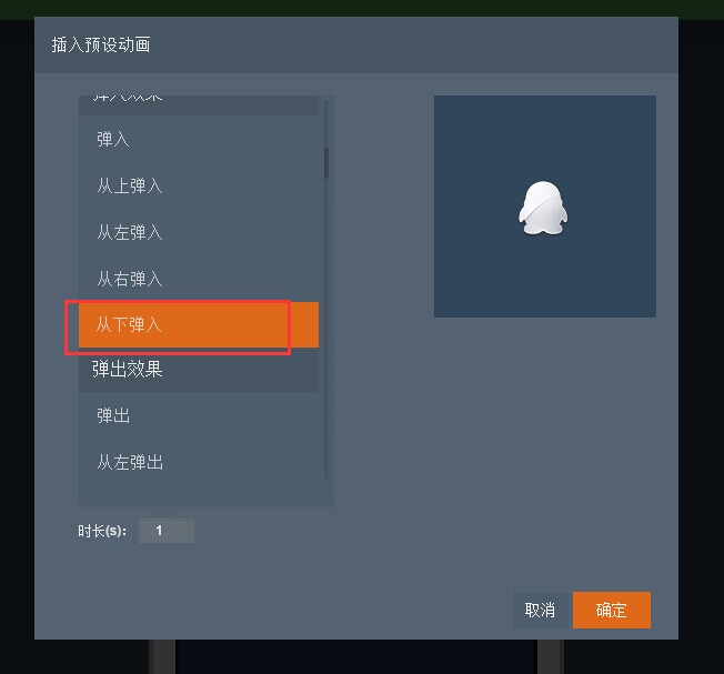 此时会看到弹出的预设动画选择框,从中选择动画 “从下弹入”: