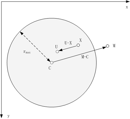 局部变化以一个圈为变化环境,C 点是圆心,r 是半径,当 C 移动到 M 这个点时,U 移动到 X。