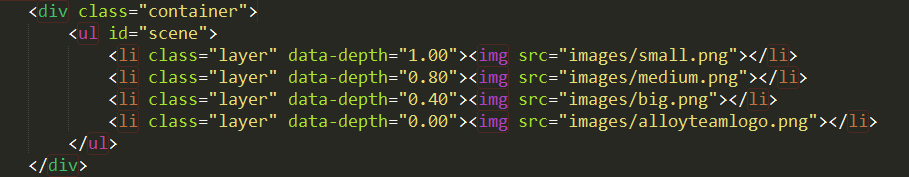 然后我新建了一个.html 文件,实现 HTML 结构。其中,data-depth 属性定义的是该层的深度,数值越大代表运动的越激烈,”0.00“ 为固定不动。