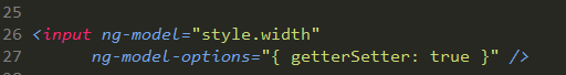 有些时候,ng-model 并不能满足所有的场景需求,这个时候可以考虑使用 set、get 方法做一层拦截,这样就可以更好的控制数据绑定,如下