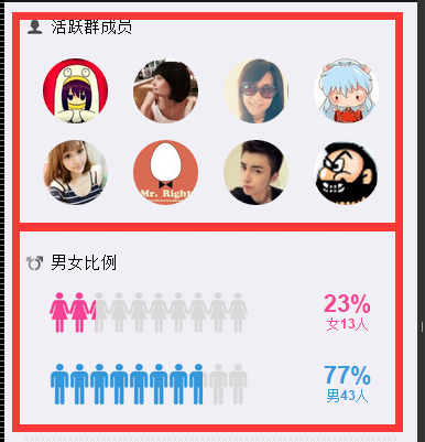 首先要对页面尽可能地划分好不同的模块,亦即 Pagelet。读过上一篇优化文章的人都记得,手 Q 群成员分布可以分为活跃群成员、男女比例、省市分布、年龄四大模块,如下面图片红框标框好的部份。
