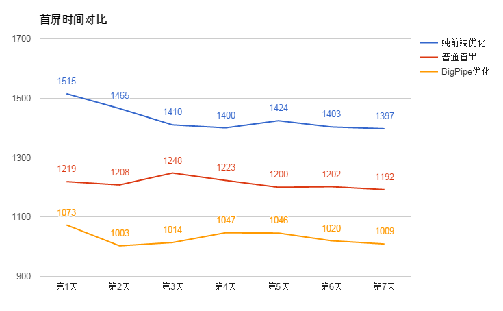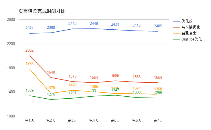 页面渲染完成时间方面,纯前端的的优化对比优化前有了质的飞跃(在前一篇文章也提到),性能提升 33%。普通直出对纯前端的优化提升约 200ms, 性能提升约 13.3%。而 BigPipe 优化跟普通直出优化则没有非常明显的优劣,只快了几十毫秒。