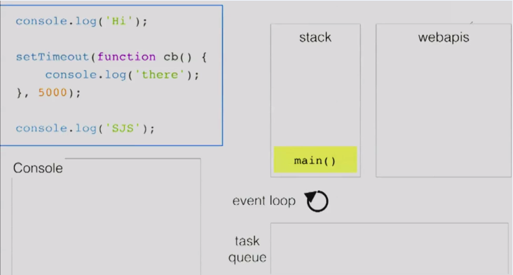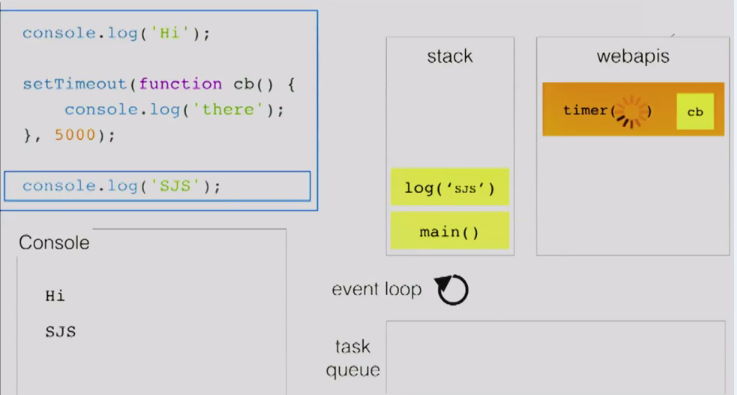 执行引擎将 setTimeout 出栈执行时,将延时处理方法交由了 webkit timer 模块处理,然后立即继续往下处理后面代码,于是将 log('SJS') 加入执行栈,接下来 log('SJS') 出栈执行,输出 SJS。而执行引擎在执行万 console.log('SJS') 后,程序处理完毕,main() 方法也出栈。