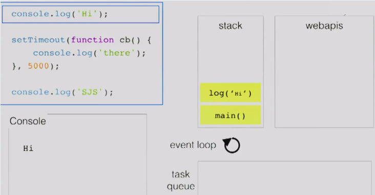 以图中代码为例,执行引擎开始执行上述代码时,相当于先讲一个 main() 方法加入执行栈。继续往下开始 console.log('Hi') 时,log('Hi') 方法入栈,console.log 方法是一个 webkit 内核支持的普通方法,而不是前面图中 WebAPIs 涉及的方法,所以这里 log('Hi') 方法立即出栈被引擎执行。