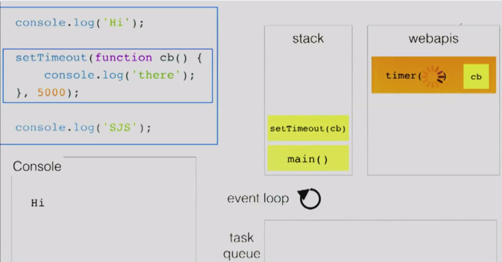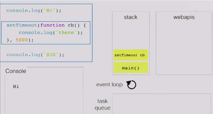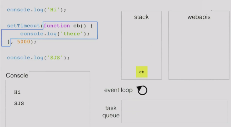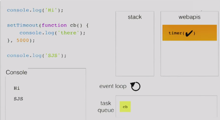 console.log('Hi') 语句执行完成后,log() 方法出栈执行,输出了 Hi。引擎继续往下,将 setTimeout(callback,5000) 添加到执行栈。setTimeout() 方法属于事件循环模型中 WebAPIs 中的方法,引擎在将 setTimeout() 方法出栈执行时,将延时执行的函数交给了相应模块,即图右方的 timer 模块来处理。