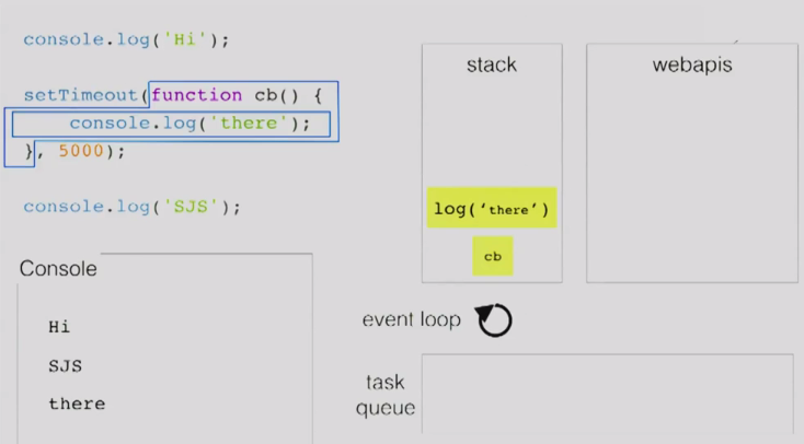 这时在在 setTimeout 方法执行 5 秒后,timer 模块检测到延时处理方法到达触发条件,于是将延时处理方法加入任务队列。而此时执行引擎的执行栈为空,所以引擎开始轮询检查任务队列是否有任务需要被执行,就检查到已经到达执行条件的延时方法,于是将延时方法加入执行栈。引擎发现延时方法调用了 log() 方法,于是又将 log() 方法入栈。然后对执行栈依次出栈执行,输出 there,清空执行栈。