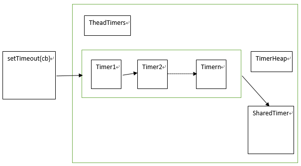 通过 setTimeout() 方法注册的延时方法,被传递给 webcore 组件 timer 模块处理。timer 中关键类为 TheadTimers 类,其包含两个重要成员,TimerHeap 任务队列和 SharedTimer 方法调度类。延时方法被封装为 timer 对象,存储在 TimerHeap 中。和 Java.util.Timer 任务队列一样,TimerHeap 同样采用最小堆的数据结构,以 nextFireTime 作为关键字排序。SharedTimer 作为 TimerHeap 调度类,在 timer 对象到达触发条件时,通过浏览器平台相关的接口,将延时方法添加到事件循环模型中提到的任务队列中。