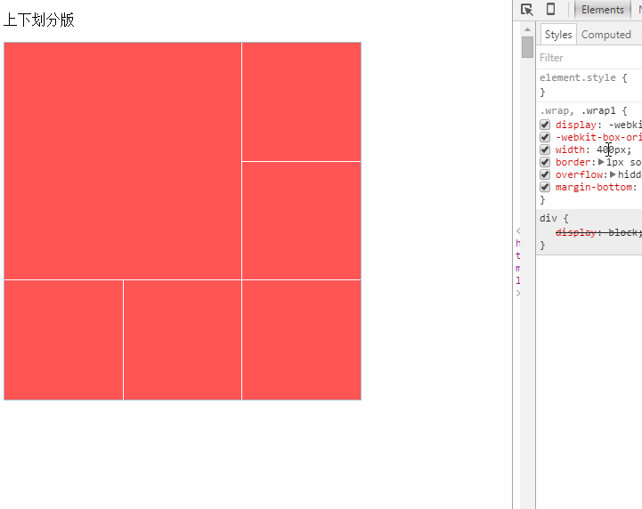 来,我们快动手分块吧!新解决方案出现导致的肾上腺素上升,使我们迫不及待使用了传统 css 文档流自上而下的方式来划分,我称为上下划分,如下图: