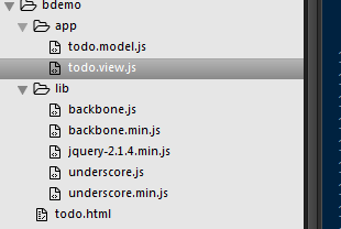 在保证项目结构清晰的情况下. 我会尽量拆分文件,这样便于管理和扩展,业务文件我按照 model 和 view 做了下拆分. 程序入口则是 todo.html, 如下,文档结构非常简单