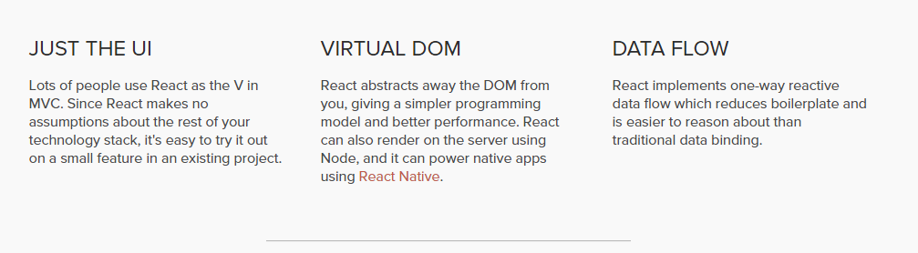 - VIRTUAL DOM, 为了方便打字,我简称它为 vdom,React 提供了一种新的 html 模版语法形式,和一整套新的接口来支持这个 vdom 的特性,通过新语法编译和接口调用,来覆盖视图渲染的过程。让界面渲染变得相对透明,这样才可以衍生出服务端渲染和 ReactNative 的玩法,不用做大改动的前提下,同一套代码能在各种载体中渲染。