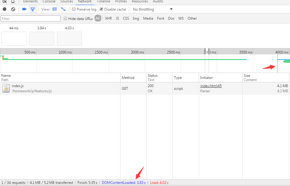 很明显,js 文件的加载时间会影响这个事件的触发事件。那 js 代码的解析时间会不会影响?我们在最后一个外联 js 文件后面打了一个点,它的时间是: