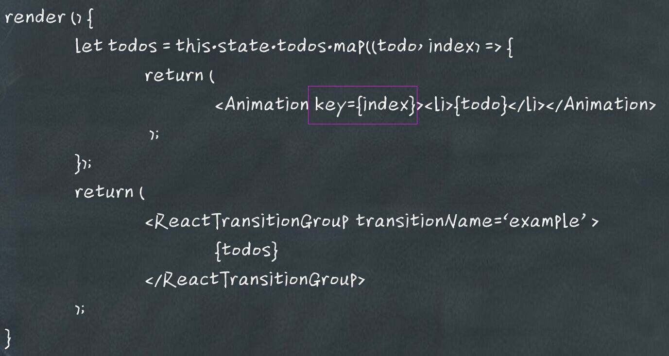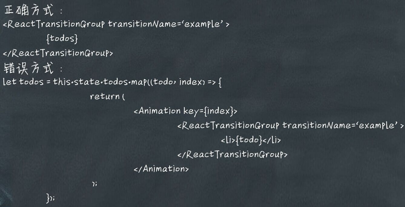 ①. 一定要为 ReactCSSTransitionGroup 的所有子级提供 key 属性。即使只渲染一个项目。React 靠 key 来决定哪一个子级进入,离开,或者停留。