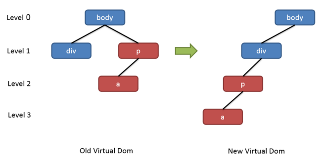 若使用传统的 diff 算法,判断 body 第一个子节点,旧的为 div,新的为 p,节点不一样,则删除 div 节点,新增插入 p 节点。之后节点操作类似,因此总的需要进行三次节点删除和新增。