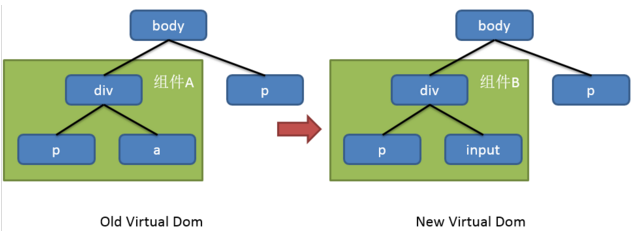 如使用传统的 diff 算法,会计算出只需删除 div 的子节点 a,并创建 div 子节点 input。