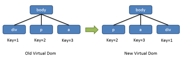 而采用 react 的 diff 算法,因为节点多了 key 来标识,两个 Virtual Dom 比较时,发现 level1 下的三个节点其实是一样的(key=1、key=2、key=3)。