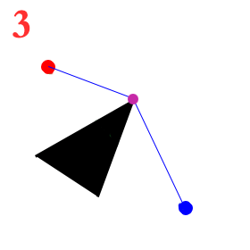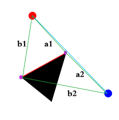 我们找必过点的方式就是首先找到连线最后相交的障碍物的两点,然后针对这两点分别求到起点和终点的距离