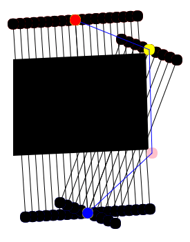 那么多黑点黑线是平移的轨迹,然后黄点是第一个必过点,此时发现黄点无法与蓝色点相连,那么 continue,以黄点为起点和蓝点为终点,找出第二个必过点粉色的点