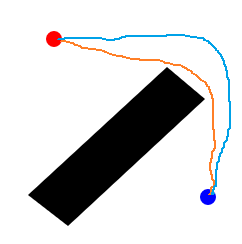 function check(start, end, obstacles) { var isCollision = true; // 结束判断符 var dir = 0; // 方向 isBodyCross(start, end, obstacles); function isBodyCross(currStart, currEnd, obstacles) { var unit = 50; // 每次平移的基数单位 var index = 0; // 偏移的次数 var changeX = 0; // 平移x方向的具体改变量 var changeY = 0; // 平移y方向的具体改变量 var door1 = true; var door2 = true; k = (currEnd.y - currStart.y) / (currEnd.x - currStart.x); // 连线的斜率 kk = -1 / k; // 连线的垂直线的斜率 if(Math.abs(k) > 1) { // 以x为单位的变动 changeX = 10; changeY = 10 * kk; } else { // 以y为单位的变动 changeX = 10 / kk; changeY = 10; } while(isCollision) { // 当不碰撞的时候结束循环 if(index > 1000) { // 增加一个界限 alert('Error'); return ; } // 开始某个方向的寻路 door1 = true; nextStart = { x: currStart.x + changeX * index, y: currStart.y + changeY * index }; nextEnd = { x: currEnd.x + changeX * index, y: currEnd.y + changeY * index }; for(var i = 0; i < obstacles.length - 1; i++) { result = isLineCross(nextStart, nextEnd, obstacles[i], obstacles[i + 1]); if(result) { // 连线碰撞 x1 = obstacles[i]; // 最后碰撞边上的点 y1 = obstacles[i + 1]; // 最后碰撞边上的点 door1 = false; drawRole(nextStart, nextEnd); break; } } if(door1) { // 没有阻碍 dir = 1; isCollision = false; break; } // 另一个方向的寻路 door2 = true; nextStart = { x: currStart.x - (changeX * index), y: currStart.y - (changeY * index) }; nextEnd = { x: currEnd.x - (changeX * index), y: currEnd.y - (changeY * index) }; for(i = 0; i < obstacles.length - 1; i++) { result = isLineCross(nextStart, nextEnd, obstacles[i], obstacles[i + 1]); if(result) { x2 = obstacles[i]; y2 = obstacles[i + 1]; door2 = false; drawRole(nextStart, nextEnd); break; } } if(i === obstacles.length - 1) { // 检测完障碍物上的边,没有碰撞 dir = -1; isCollision = false; break; } index++; } if(door1 || door2) { fixPoint(changeX, changeY); // 确定必过点 } } function fixPoint(changeX, changeY) { var dis1; var dis2; var f; var x, y; if(dir === 1) { x = x1; y = y1; } else { x = x2; y = y2; } if(typeof x === 'undefined') { return ; } // 算距离 dis1 = distance(x, nextStart, nextEnd); dis2 = distance(y, nextStart, nextEnd); var symbolX; var symbolY; if(dis1 < dis2) { // 比较距离的大小,得出必过点,此时x是必过点 // 下面两个if用来将必过点往整个障碍物外面偏移一点 if(x.y > y.y) { symbolY = 1; } else { symbolY = -1; } if(x.x > y.x) { symbolX = 1; } else { symbolX = -1; } f = { // 偏移后的必过点 x: x.x + (5 * symbolX), y: x.y + (5 * symbolY) }; drawCircle(f, 'green'); } else { // 必过点是y if(y.y > x.y) { symbolY = 1; } else { symbolY = -1; } if(y.x > x.x) { symbolX = 1; } else { symbolX = -1; } f = { // 最终必过点的位置 x: y.x + (5 * symbolX), y: y.y + (5 * symbolY) }; drawCircle(f, 'pink'); } // 将必过点添加到最终路径 f.index = end.index; globalPath.splice(f.index, 0, f); for(var i = 0; i < globalPath.length; i++) { globalPath[i].index = i; } // 下一轮计算前这些值设置为undefined x1 = undefined; y1 = undefined; x2 = undefined; y2 = undefined; var tmp = redressPoint(globalPath[f.index - 1], f, limit); // 矫正 check(tmp, f, obstacles); tmp = redressPoint(globalPath[f.index + 1], f, limit); // 矫正 check(f, tmp, obstacles); } } |