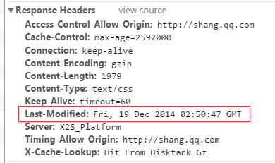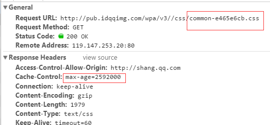 我们来找个资源看下。比如 shang.qq.com 上的 css 资源,max-age=2592000,也就是说缓存有效期为 2592000 秒(也就是 30 天)。于是在 30 天内都会使用这个版本的资源,即使服务器上的资源发生了变化,浏览器也不会得到通知。max-age 会覆盖掉 Expires,后面会有讨论。