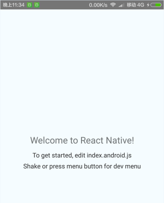 如上图,填写 192.168.1.100:8081 即可,回退到主界面,再次摇晃手机调出 app debug 菜单选项 -> 选择 Reload JS,此时可以看到 ReactNative 的应用首页: