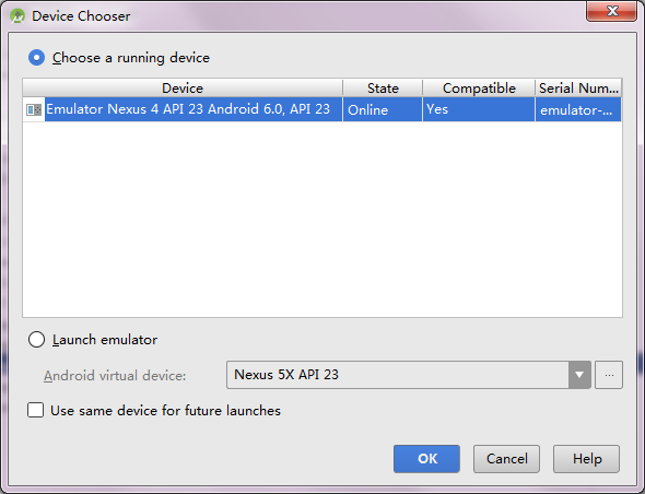 当 Android 虚拟设备启动成功后,运行 HelloAndroid 应用 app,选择已启动的虚拟设备即可在虚拟设备上打开我们的 HelloAndroid。