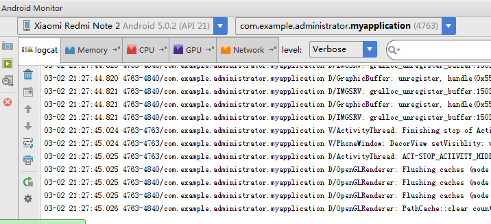 保持程序运行状态,我们可以在 AndroidStudio 控制台上查看程序输出的 log 日志及 CPU/内存等占用情况。