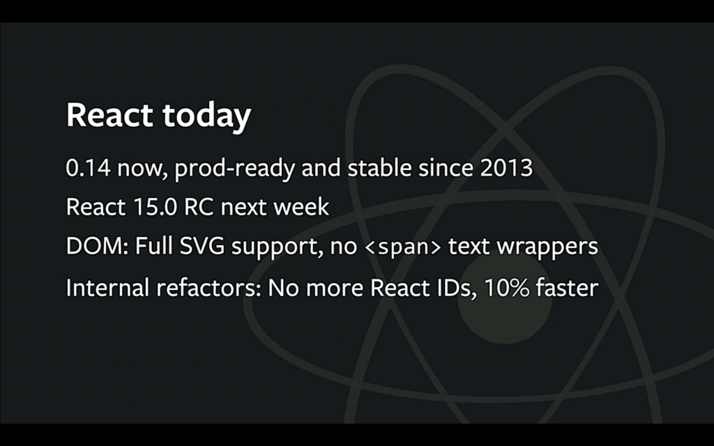 译者按:2016 年 React.js 大会在今年 1 月份举行,2 月底放出了视频,本文翻译的是其中一个演讲 What Lies Ahead(自备梯子), 介绍了 React 目前的进展,以及未来的研发方向。