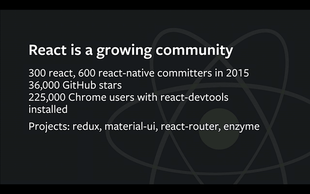 在 2015 年,我们有 300 个人给 react 贡献代码,600 个人给 react-native 贡献代码,这么多人,估计这个会场都坐不下了。我们在 Github 上获得了 36000 个 star,只是个虚荣的数字,我提到这个数字是因为我们想知道有多少开发者在使用 React 了,而 Google 可以告诉我们,已经有 225,000 个人安装了 Chrome 的 react-devtools,这意味着成千上万人已经在用 React 构建应用了,这太令人兴奋了。不仅仅是数字,我们还有很多关于 React 的优秀项目,比如 Redux、material-ui,react-routers,enzyme,解决了很多我们都没考虑过的问题。