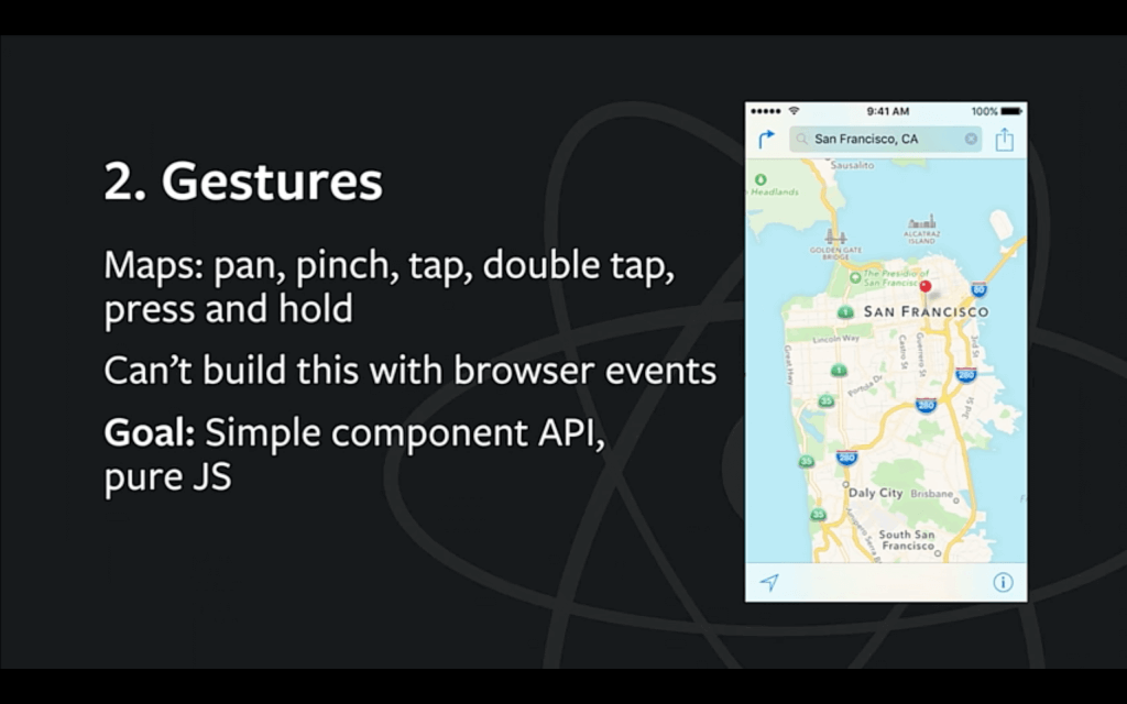 这些操作加起来,体验确实很优秀。但没有合适的代码抽象时,这个应用很难开发出来,事实上在 web 基本不可能用 touchstart,touchmove,touchend 开发出来,因为这不是我们想要的接口。我们需要的是一个基于它们的手势系统,可以推断用户的手势操作,预测用户的行为。所以我们的目标是做一个手势系统,有简单的组件 API,而且是纯 JS 实现。React Native 可以在 iOS 和 Android 上借用系统的能力,但我们不想考虑跨平台的问题,这样 Web 上也可以有良好的手势体验。