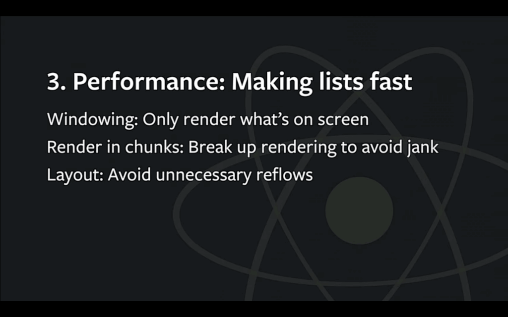 我们的第二个想法是,将列表内容分块渲染。当你在滚动一个列表的时候,一个新的列表项出现在屏幕上了,看看这个新项的复杂度,如果是个非常复杂的东西,比如一条 Facebook 的状态,有作者,内容,图片,视频,评论,点赞等等,几十个视图需要在屏幕上渲染,这可能 50 到 100ms,此时滚动就开始变得不流畅,反应迟钝了。如果 React 可以只渲染这条状态的一部分,保持滚动流畅,然后再慢慢分帧渲染这条状态,这样就可以使应用持续保持响应了。