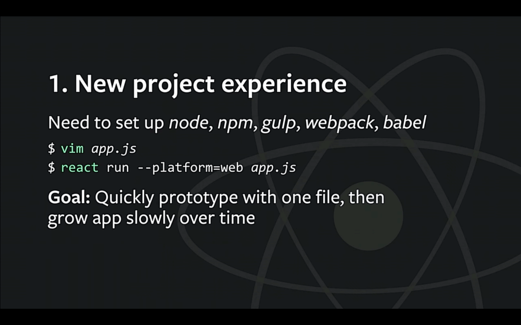 我们理想的开发模式是,只需要创建一个指向根页面的 app.js,然后用 react 运行它,就可以直接打开浏览器看效果了。如果指定平台是 ios 或者 android,可以打开对应的模拟器。而随着项目的逐渐发展,我们为了性能优化,提高扩展性等原因,可以慢慢地把上面列到的工具加进项目中,但它们不应该是启动新项目时的必须项。