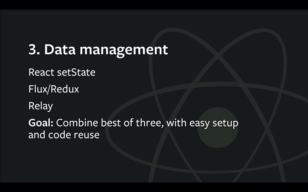 第三种数据管理的方式,Relay,在 Facebook 内部就非常流行,目前开源社区对它的关注也在不断增加。Relay 允许组件自由地获取自己需要的数据,而不是 “通知 server 去获取数据,提供 API,然后在数据中心拉取 API,再填充到组件”。 基本上 10 行代码就可以搞定了,我们称之为 Colocated Query。我们认为这玩意意义非凡,已经在 Facebook 内部用上了,不过如果没有一个支持 GraphQL 的 server,relay 就玩不转了,不幸的是目前大多数人都没有 GraphQL Server。不过如果你有很多纯客户端数据需要管理的话,Relay 也不能帮上太多忙,因为在服务端没有对应的副本。