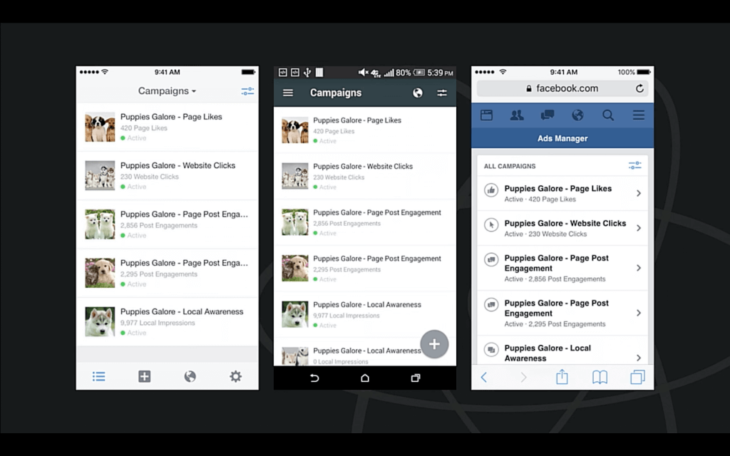 谈到代码复用,我想给大家看看 Facebook 第一个完全用 React Native 实现的 APP,这是一个用来创建和管理 Facebook 广告的 app,可以看出 iOS 与 Android 的界面很像,但是设计上都符合各自的系统规范,看起来像是原生的,而实际上它们有 90% 的代码是共用的。我们还有一个移动 web 版,它和 App 版共享一点点数据逻辑层的代码,完全不复用 UI 代码。但可以看到他们相似的基本特征与系统目标,同样的广告活动列表。