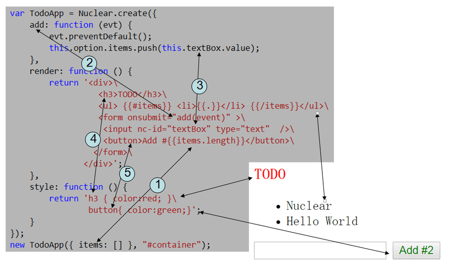 var TodoApp = Nuclear.create({ add: function (evt) { evt.preventDefault(); this.option.items.push(this.textBox.value); }, render: function () { return '<div>\ <h3>TODO</h3>\ <ul> {{#items}} <li>{{.}}</li> {{/items}}</ul>\ <form onsubmit="add(event)" >\ <input nc-id="textBox" type="text" />\ <button>Add #{{items.length}}</button>\ </form>\ </div>'; } }); new TodoApp({ items: [] }, "#todoListContainer"); |