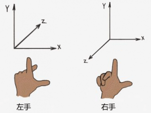 那我们更深层的考虑下为什么 x 和 y 的位置没人怀疑,因为“ 左手坐标系” 和“ 右手坐标系” 中 x,y 轴是一样的,如图所示