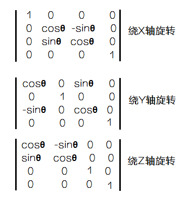 然后是经典的围绕各个轴的旋转矩阵 (记忆的时候注意围绕 y 轴旋转时,几个三角函数的符号……)