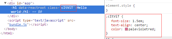 styled.h1 函数返回一个 React Component,styled components 会为这个 React Component 添加一个 class,该 class 的值为一个随机字符串。传给 styled.h1 的模板字符串参数的值实际上是 CSS 语法,这些 CSS 会附加到该 React Component 的 class 中,从而为 React Component 添加样式: