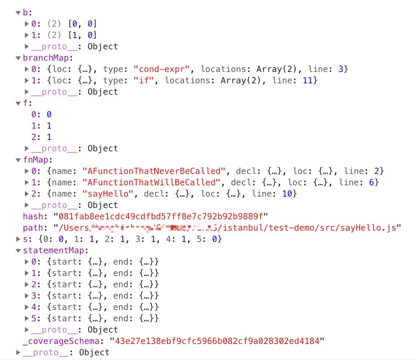细心的朋友可能发现缺少了行覆盖率指标 Lines 计数器,其实行覆盖率是通过语句中的起始行和结束行之间语句的执行率计算得来的。如果再把 cov_1pwyfn0t92 这个对象展开来看里面的内容,那么经过装饰器 “装饰” 后的产出和解析结果就更加直观明了了: