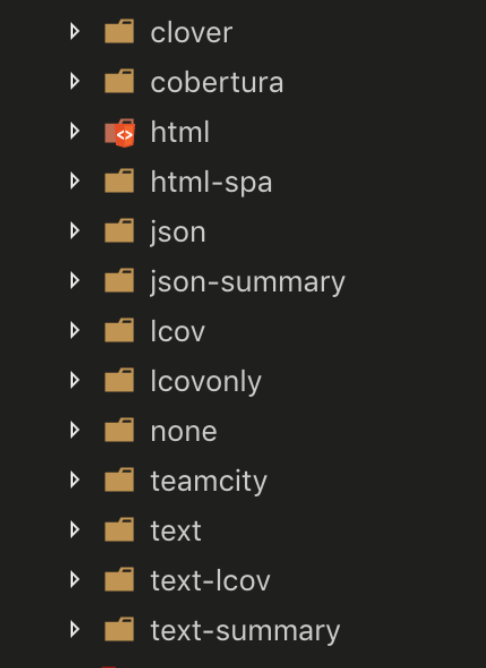经过了前面的步骤,已经篡改了源代码并注入计数器,那么执行完测试用例后再去收集每一个文件的四个指标覆盖率就水到渠成了,最后拿到结果就可以输出直观的统计报告,Istanbul 支持输出多种统计报告类型: