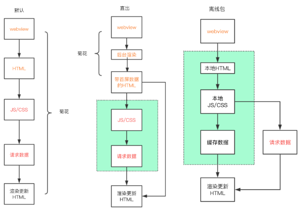 通过离线包技术能够很好解决 html 文件本身加载需要时间的问题。离线包基本思路都是通过 webview 统一拦截 url,将资源映射到本地离线包,更新的时候对版本资源检测,下载和维护本地缓存目录中的资源。比如腾讯的 webso 和 Alloykit 的离线包方案。