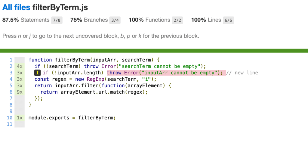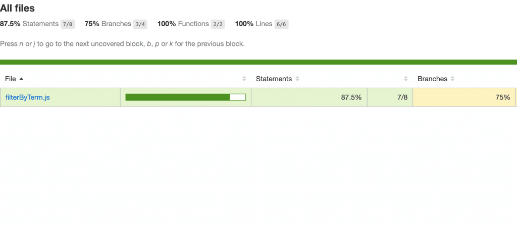 PASS __tests__/filterByTerm.spec.js Filter function ✓ it should filter by a search term (link) (3ms) ✓ it should filter by a search term (uRl) (1ms) ✓ it should throw when searchTerm is empty string (2ms) -----------------|----------|----------|----------|----------|-------------------| File | % Stmts | % Branch | % Funcs | % Lines | Uncovered Line #s | -----------------|----------|----------|----------|----------|-------------------| All files | 87.5 | 75 | 100 | 100 | | filterByTerm.js | 87.5 | 75 | 100 | 100 | 3 | -----------------|----------|----------|----------|----------|-------------------| Test Suites: 1 passed, 1 total Tests: 3 passed, 3 total |