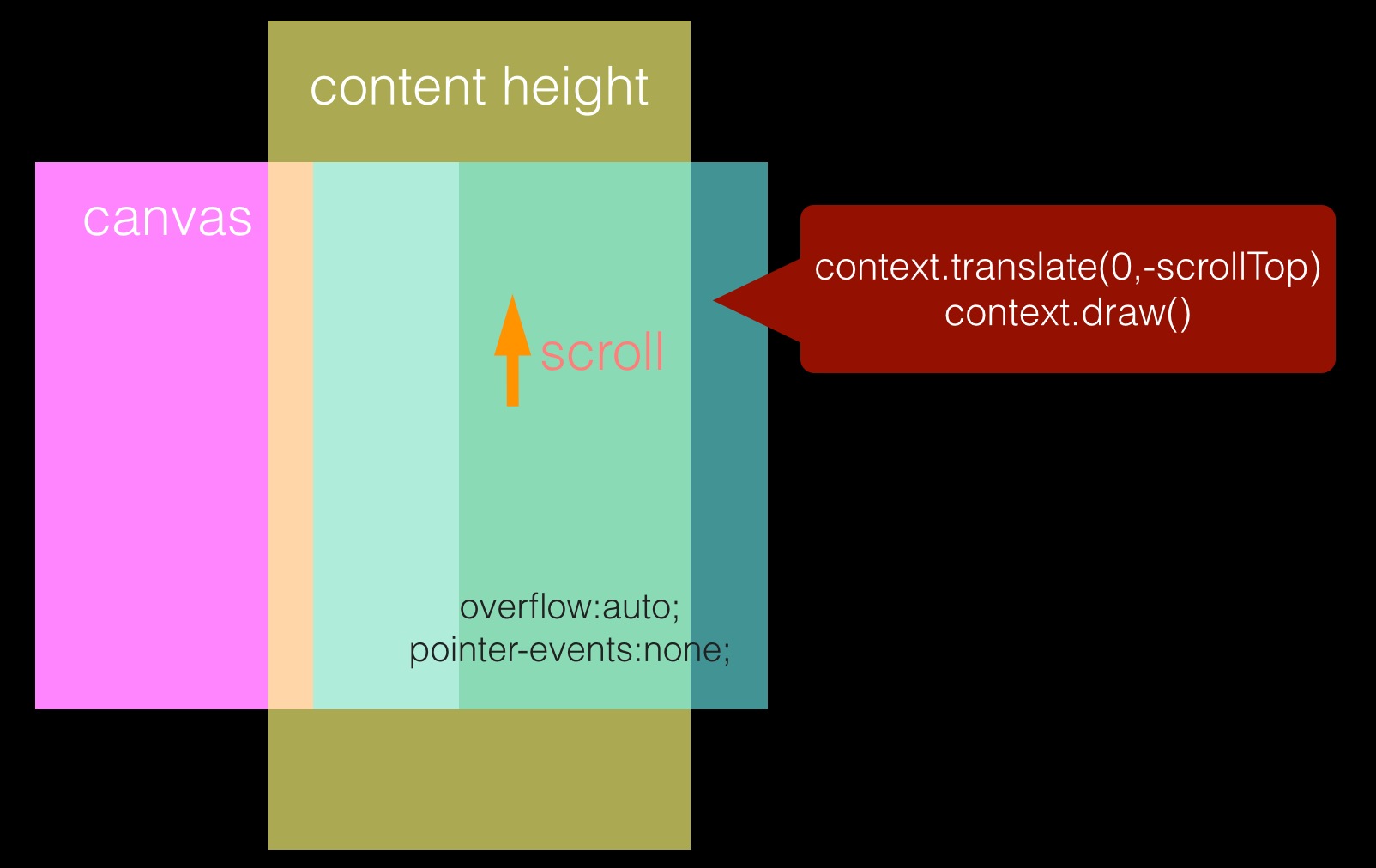 该方法是把两个父子关系的透明 div 盖在 canvas 上面,设置子 div 高度为内容高度,并监听父 div 的 scroll 事件,在 scrol 事件的处理程序中获取 scrollTop 并用于改变 Canvas 2dContext 的绘制原点。该方案相比方案 1 的好处是不用通过 js 代码监听用户手势事件并模拟滚动的缓动效果,而是直接使用原生的浏览器滚动。