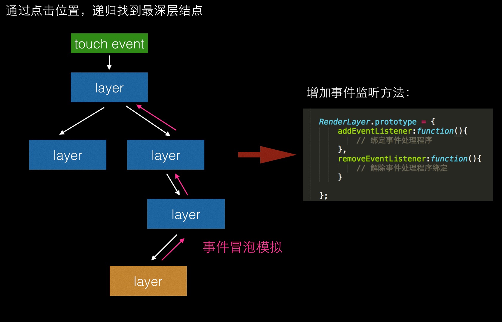 对于 click,touch 等 dom 事件的模拟,我们采用的方案是根据点击区域进行检测,并找出最底层的元素,递归寻找父元素并触发对应事件处理程序,从而模拟事件冒泡。
