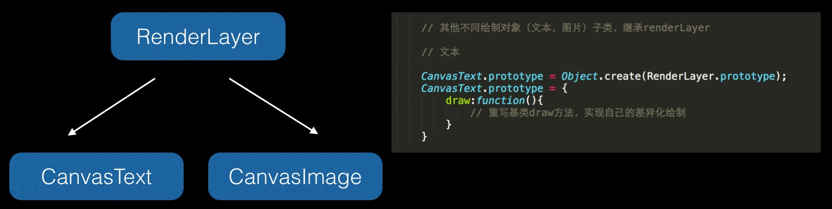 其中 CanvasText 类和 CanvasImage 类分别都继承于 RenderLayer 类,并且由于它们各有不同的展示方式,因此它们分别实现自己的 draw 方法,做定制化的展示。